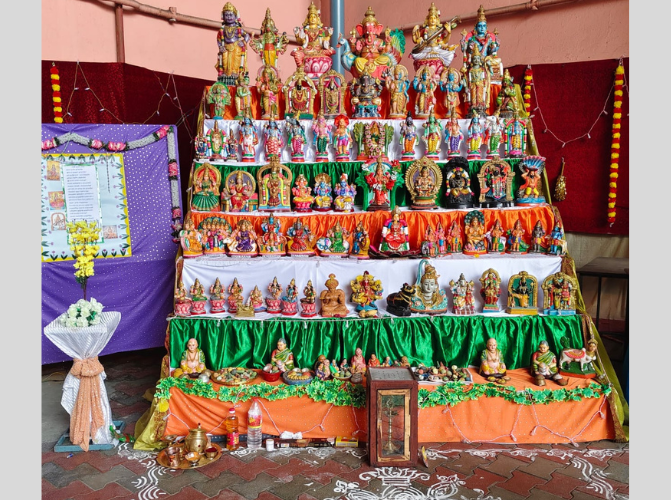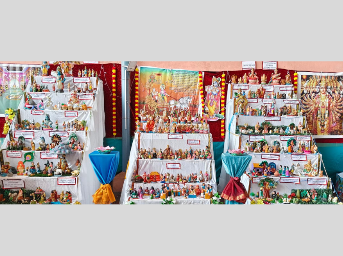 Sri Sankara Matriculation Higher secondary School at ThirhvalluvarNagar,Ch-41. celebrates Navaratri from 22nd September with great devotion and enthusiasm, centered around the theme "Vishwas." The colourful dolls displayed in four sections highlight the theme 'Vishwas', as reflected in The Ramayana, The Mahabharata, stories, Indian literature and there is one section of grand display of dolls also following the traditional format - all arranged by Staff,Substaff and Students . The Trichy Malaikottai Pillayar Temple is this year's special attraction. Everyday, we have visitors including our parents, other school teachers and general public, who are mesmerized by the eye catching cultural events of our students. Through such events, our school always proves that we leave no stone unturned in imparting value education, besides academics , says